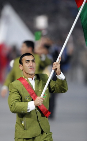 | Guvanch Nurmuhammedov leads the Olympic delegation of Turkmenistan as they parade during the opening ceremony of the 2008 Beijing Olympic Games at the National Stadium, also known as the "Bird's Nest", on August 8 2008. [Agencies] |