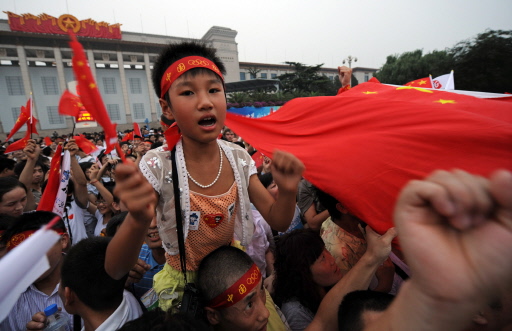 People cheer the start of the 2008 Beijing Olympic Games on August 8, 2008, in Tian'anmen Square in Beijing.[Agencies]