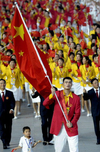 Basketballer Yao Ming leads China's delegation into the National stadium in Beijing during the opening ceremony of the 2008 Beijing Olympic Games on August 8, 2008. Over 10,000 athletes from some 200 countries and regions are going to compete in 38 different disciplines during the event. [Agencies]