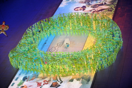 General view shows Chinese young pianist Lang Lang and five-year-old Li Muzi performing surrounded by dancers forming the national stadium during the opening ceremony of the 2008 Beijing Olympic Games in Beijing on August 8, 2008. [Agencies] More photos