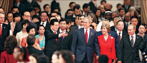 President Hu Jintao and his wife Liu Yongqing enter the banqueting hall yesterday, accompanied by George W. Bush and other special guests. [China Daily]