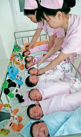 Nurses attend to newborns in the No 1 People's Hospital in Xiangfan, Hubei province, August 8 2008. [China Daily]