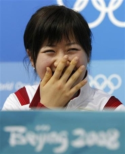 Japanese table tennis player Ai Fukuhara covers her mouth while laughing as she speaks to the media during a news conference at the Olympic Village in Beijing, ahead of the 2008 Olympic Games, August 7, 2008. [Agencies]