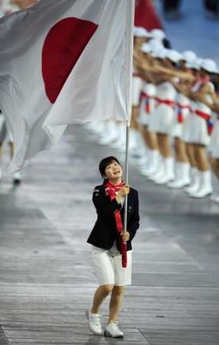 Japan's flag-bearer Ai Fukuhara marches during the opening ceremony of the Beijing 2008 Olympic Games at the National Stadium, August 8, 2008. [Agencies]