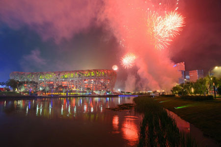 Fireworks explode over the National Stadium, better know as the Bird's Nest (R) and the National Aquatics Center (L) during the opening ceremony of the 2008 Beijing Olympic Games on the Olympic Green in Beijing on August 8, 2008. [Agencies]