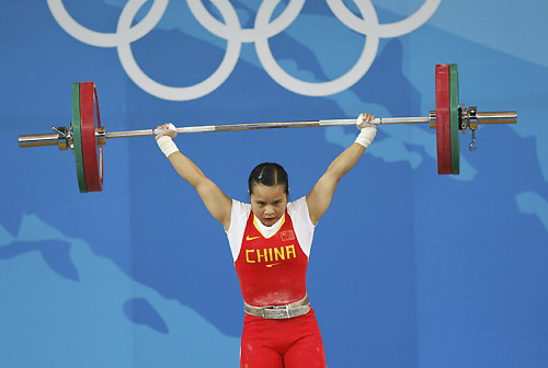 Chen Xiexia of China lifts the bar above her head in the women's 48kg jerk weightlifting competition starts in the the Beijing University of Aeronautics and Astronautics Gymnasium with the women's 48kg class August 9, 2008. [Xinhua]