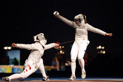 China's Xue Tan (L) competes against Russian Federation's Sofiya Velikaya during their women's individual sabre eliminations quarter final match on August 8, 2008 at the Fencing Hall of National Convention Center in Beijing, as part of the of the 2008 Beijing Olympic Games. [Agencies]
