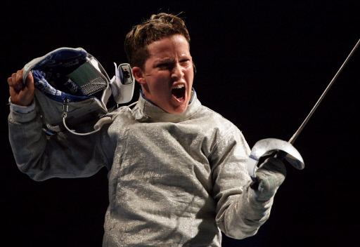 Hungary's Nagy Orsolya celebrates after winning her Women's individual sabre eliminations match against French Anne-Lise Touya on August 8, 2008 at the Fencing Hall of National Convention Center in Beijing, as part of the of the 2008 Beijing Olympic Games. Orsolya won the match. [Agencies]