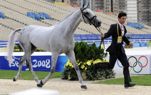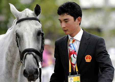 China's Eventing rider Hua Tian Alex shows his horse "Watership Down" on the First Inspection for the Eventing competition in Hong Kong on August 8, 2008. The eventing riders will be assessed in Dressage, Jumping and Cross Country. [Agencies]
