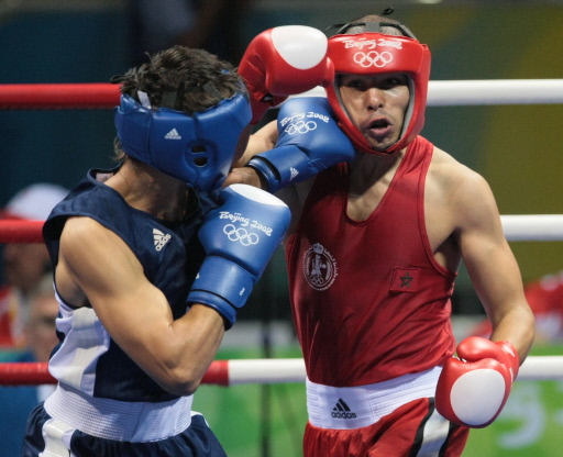 Kazakhstan's Artayev Bakhtiyar (L) fights against Morocco's Said Rachidi during their Beijing 2008 Olympic Games Middleweight (75 kg) boxing bout on August 09, 2008 in Beijing. [Agencies]