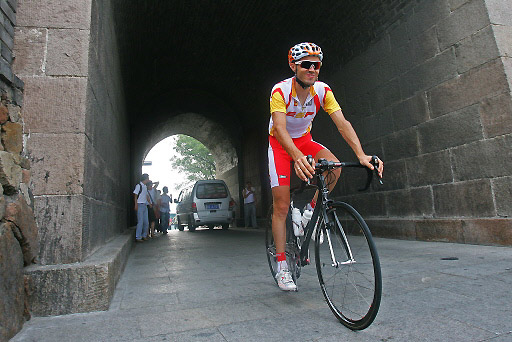 Spain's Samuel Sanchez rides through a tunnel after a training session near the Great Wall in Badaling, 78 Km Northern from Beijing before the Games. Sanchez won gold in men's cycling road race. [Agencies]