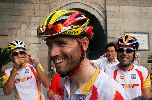 Alejandro Valverde (C), Samuel Sanchez (L) and Oscar Freire (R), of Spain'scyclingteam, take a break during a training session near the Great Wall of China in Badaling, 78 km north of Beijing on August 5, 2008 just three days ahead of the opening of the 2008 Beijing Olympic Games. Sanchez won gold in men's cycling road race. [Agencies]