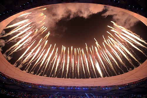 Fireworks explode over the National Stadium, better know as the Bird's Nest. The 2008 Summer Games opened in Beijing and will run until from August 24. [Xinhua]