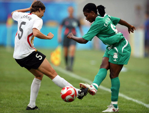 Annike Krahn (L) of Germany fights for the ball with Ifeanyi Chiejine of Nigeria during the women's first round Group F football match Nigeria vs Germany of the 2008 Beijing Olympic Games at the Shenyang Olympic Stadium on August 9, 2008. Germany beat Nigeria 1-0. [Agencies]