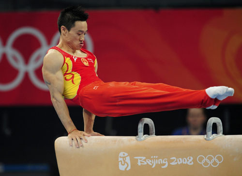 Yang Wei of China competes in the men's qualification pommel horse during the artistic gymnastics competition at the Beijing 2008 Olympic Games August 9, 2008. [Agencies]