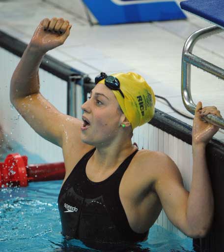 Australia's Stephanie Rice celebrates after winning the women's 400m individual medley swimming final at the National Aquatics Center in the 2008 Beijing Olympic Games on August 10, 2008 in Beijing. Stephanie Rice of Australia broke the world record in the women's 400 metres individual medley in a time of four minutes 29.45 seconds at the Beijing Olympics on Sunday. [Agencies]