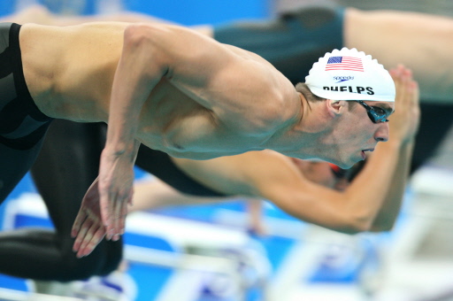 US swimmer Michael Phelps dives during the men's 400m individual medley swimming heat at the National Aquatics Center at the 2008 Beijing Olympic Games on August 9, 2008 in Beijing. [Agencies]