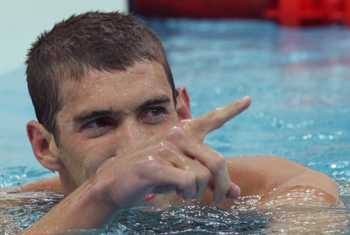 US swimmer Michael Phelps celebrates after the men's 400m individual medley swimming final at the National Aquatics Center during the 2008 Beijing Olympic Games on August 10, 2008 in Beijing.[Agencies]