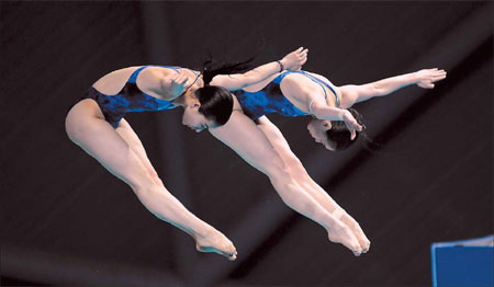 Guo Jingjing (left) and Wu Minxia compete today. [China Daily] |