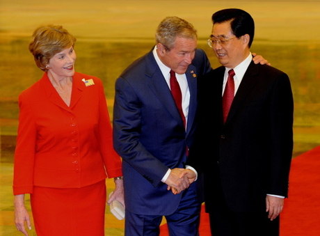 This photo taken on August 8, 2008 shows US President George W. Bush (C) being watched by his wife Laura (L) as he shakes hands with the Chinese President Hu Jintao before a reception in the Great Hall of the People in Beijing. [Agencies]