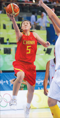 Bian Lan of China makes a shot during a Group B women's basketball game at the Wukesong Basketball Stadium August 9 2008. [China Daily]