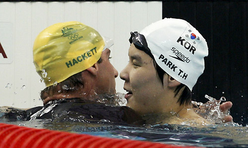 Park Tae-hwan of South Korea (R) is congratulated by Grant Hackett (L) of Australia after winning the men's 400 meters freestyle swimming final during the Beijing 2008 Olympic Games at the National Aquatics Centre, August 10, 2008. Hackett, current world's No 1, slipped to the 6th in the final. [Agencies]