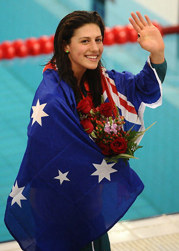 Australia's Stephanie Rice waves after the women's 400m individual medley swimming final at the National Aquatics Center in the 2008 Beijing Olympic Games on August 10, 2008 in Beijing. [Agencies]