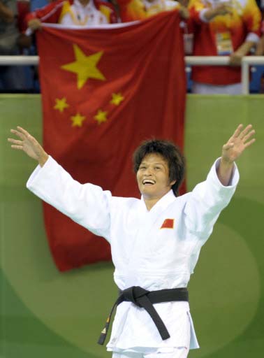 Xian Dongmei of China celebrates after defeating An Kum Ae of North Korea during their women's -52 kg final judo match at the Beijing 2008 Olympic Games, August 10, 2008. [Agencies]
