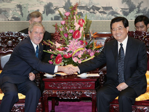 U.S. President George W. Bush (L) meets Chinese President Hu Jintao at the Zhongnanhai Compound in Beijing August 10, 2008. [Agencies]
