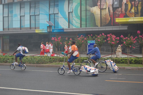 Athletes ride bikes in the Beijing Olympic Village. August 10, 2008, Beijing [China Daily]