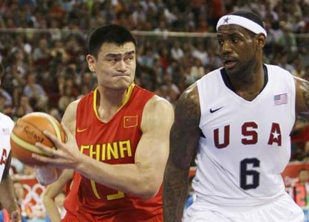 Yao Ming (L) of China is defended by Lebron James of the U.S. during their Group B men's basketball game at the Beijing 2008 Olympic Games August 10, 2008. Chinese hoopsters were beaten 70-101 by US. [Agencies]