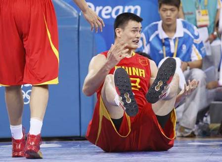 Yao Ming of China reacts after getting knocked down during a Group B basketball game against the U.S. at the Beijing 2008 Olympic Games August 10, 2008. [Agencies]