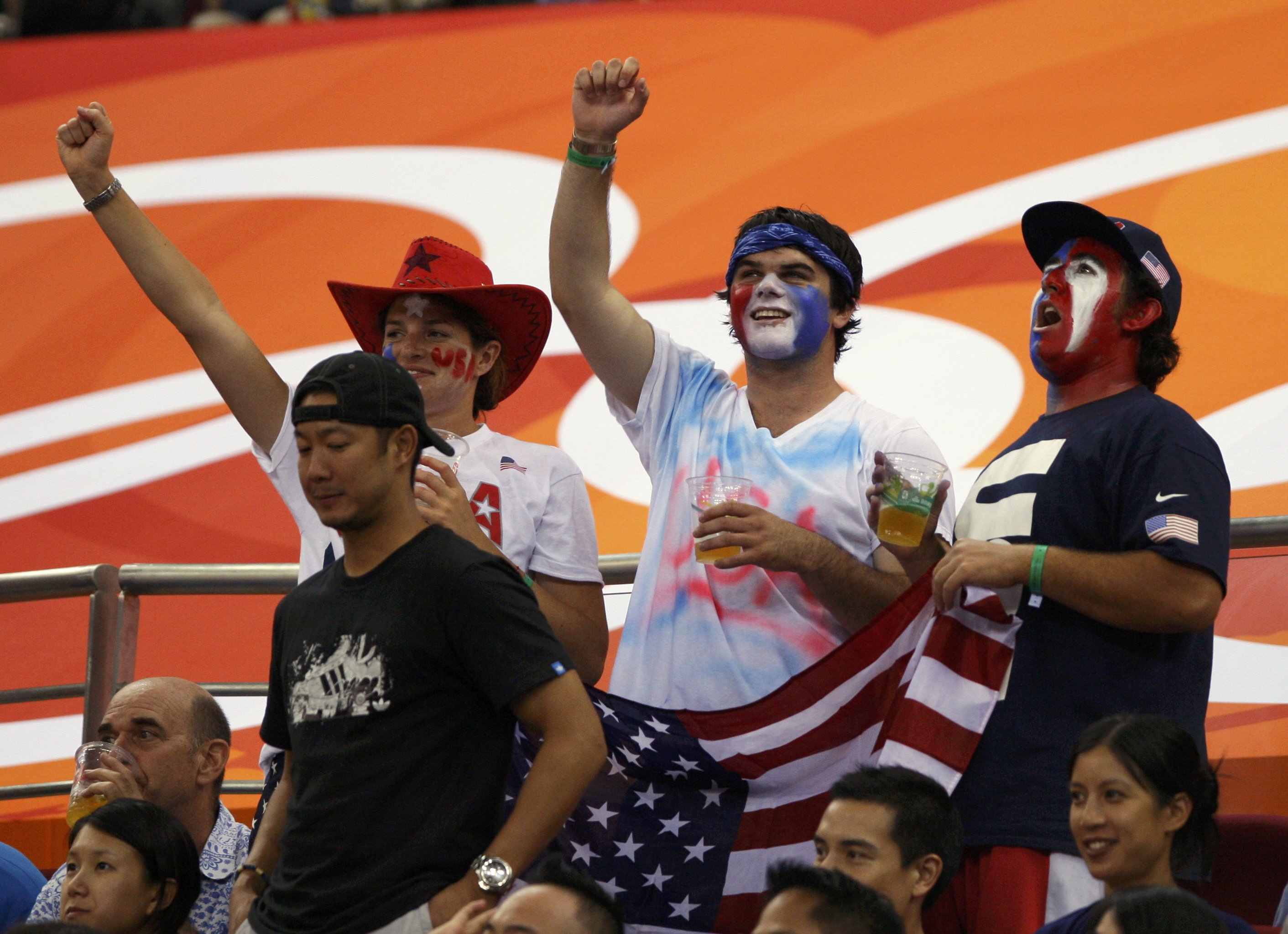 | U.S. fans cheer for their team during their Group B men's basketball game against China at the Beijing 2008 Olympic Games August 10, 2008. [Agencies] |
