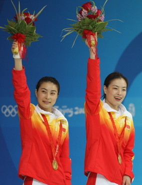 Guo Jingjing (L) and Wu Minxia of China acknowledge the crowd on the podium after the women's synchronised 3m springboard diving competition final at the 2008 Beijing Olympic Games in Beijing on August 10, 2008. [Agencies]