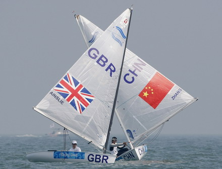 Ben Ainslie of Britain (L) and Zhang Peng of China competing in Finn class sail upwind during the first race of the sailing competition at the Beijing 2008 Olympic Games in Qingdao, Shandong province,August 9, 2008. [Agencies]