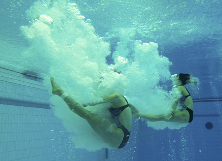 Guo Jingjing and Wu Minxia of China compete in the women's synchronised 3m springboard diving final at the National Aquatics Center during the Beijing 2008 Olympic Games August 10, 2008. [Agencies]