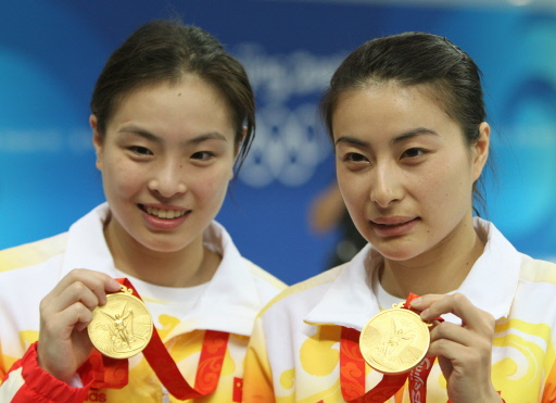 Wu Minxia (L) and Guo Jingjing of China hold their medals on the podium after the women's synchronised 3m springboard diving competition final at the 2008 Beijing Olympic Games in Beijing on August 10, 2008. The Chinese team won gold in the event with Russia in second and Germany in third. [Agencies]