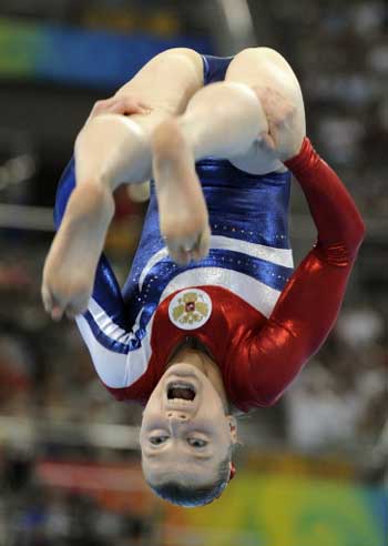 Russia's Anna Pavlova competes on the floor during the women's qualification of the artistic gymnastics event of the Beijing 2008 Olympic Games in Beijing on August 10, 2008. [Agencies]