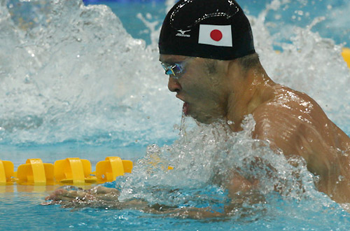 Japan's Kosuke Kitajima competes during the men's 100m breaststroke swimming semi-final at the National Aquatics Center during the 2008 Beijing Olympic Games on August 10, 2008 in Beijing. Kitajima broke the world record held by Brendan Hansen of the United States to win the final. [Agencies]