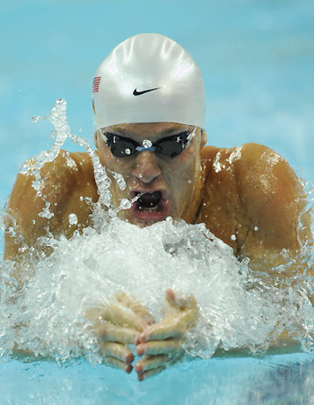 US swimmer Brendan Hansen, the previous world record holder, competes during the men's 100m breaststroke swimming heat at the National Aquatics Center in the 2008 Beijing Olympic Games on August 9, 2008. [Agencies]