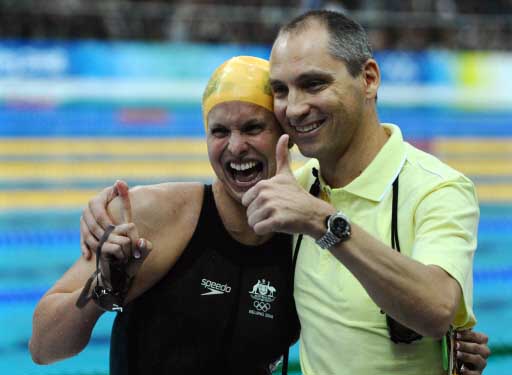 Australia's Lisbeth Trickett (L) poses with an unidentified person after taking gold in the women's 100m butterfly swimming final at the National Aquatics Center in the 2008 Beijing Olympic Games on August 11, 2008. [Agencies]