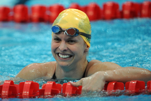 Australia's Lisbeth Trickett celebrates after winning the women's 100m butterfly swimming final at the National Aquatics Center in the 2008 Beijing Olympic Games on August 11, 2008. [Agencies]