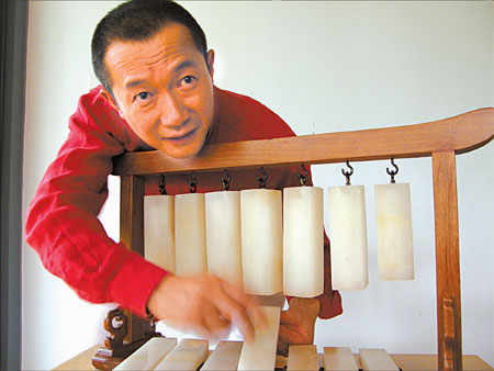 Composer Tan Dun demonstrates how to play his unique jade chimes. Courtesy of Tan Dun. [China Daily]