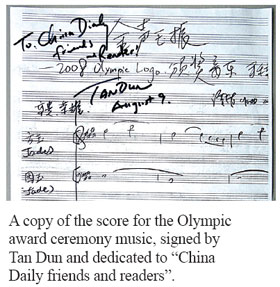 On Saturday, the first competition day of the Beijing Olympic Games, composer Tan Dun was waiting anxiously in front of his TV. Seated in his temporary home in the suburb of Changping district, the composer was eagerly anticipating the broadcast of the first ceremony for awarding Olympic medals.
