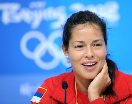 Tennis player Ana Ivanovic of Serbia attends a news conference to announce her withdrawal from the Olympic tennis event due to her injury in Beijing, China, Aug. 10, 2008. Ana Ivanovic is the world number one and newly-crowned French Open women's singles champion. [Xinhua]