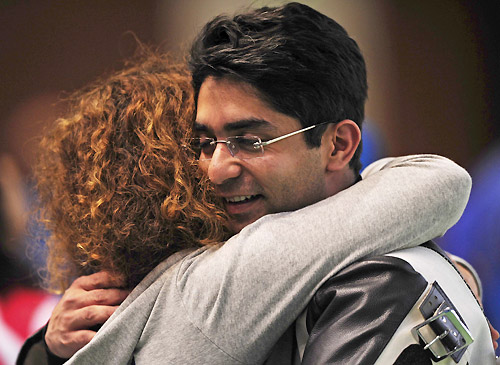 Gold medallist Abhinav Bindra of India (R) is hugged by his coach Gabriele Buhlmann aftershootingin the finals of the men's 10m air rifle competition at the Beijing 2008 Olympic Games August 11, 2008. [Agencies]