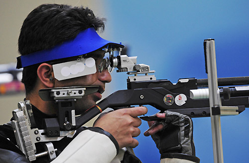 Gold medallist Abhinav Bindra of India shoots during the men's 10m air rifle final at the Beijing 2008 Olympic Games August 11, 2008. Bindra won the gold. [Agencies]