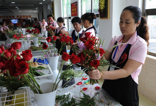Chinese florists prepare bouquet of flowers for award ceremonies at the 2008 Beijing Olympic Games on August 10, 2008. [Agencies]