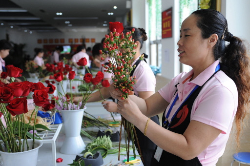 Chinese florists prepare bouquet of flowers for award ceremonies at the 2008 Beijing Olympic Games on August 10, 2008. [Agencies]