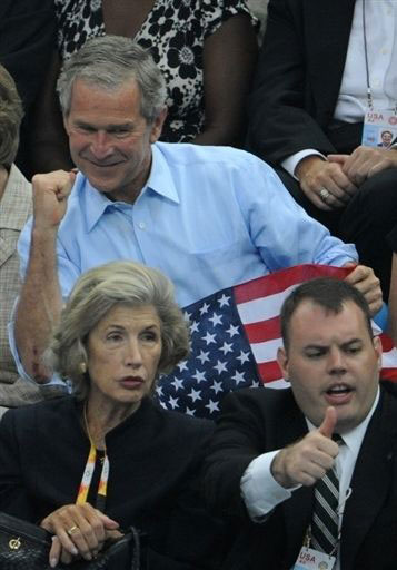 US President George W. Bush (top) holds the US flag as he arrives to watch the men's 400m individual medley swimming final at the National Aquatics Center during the 2008 Beijing Olympic Games on August 10, 2008 in Beijing.